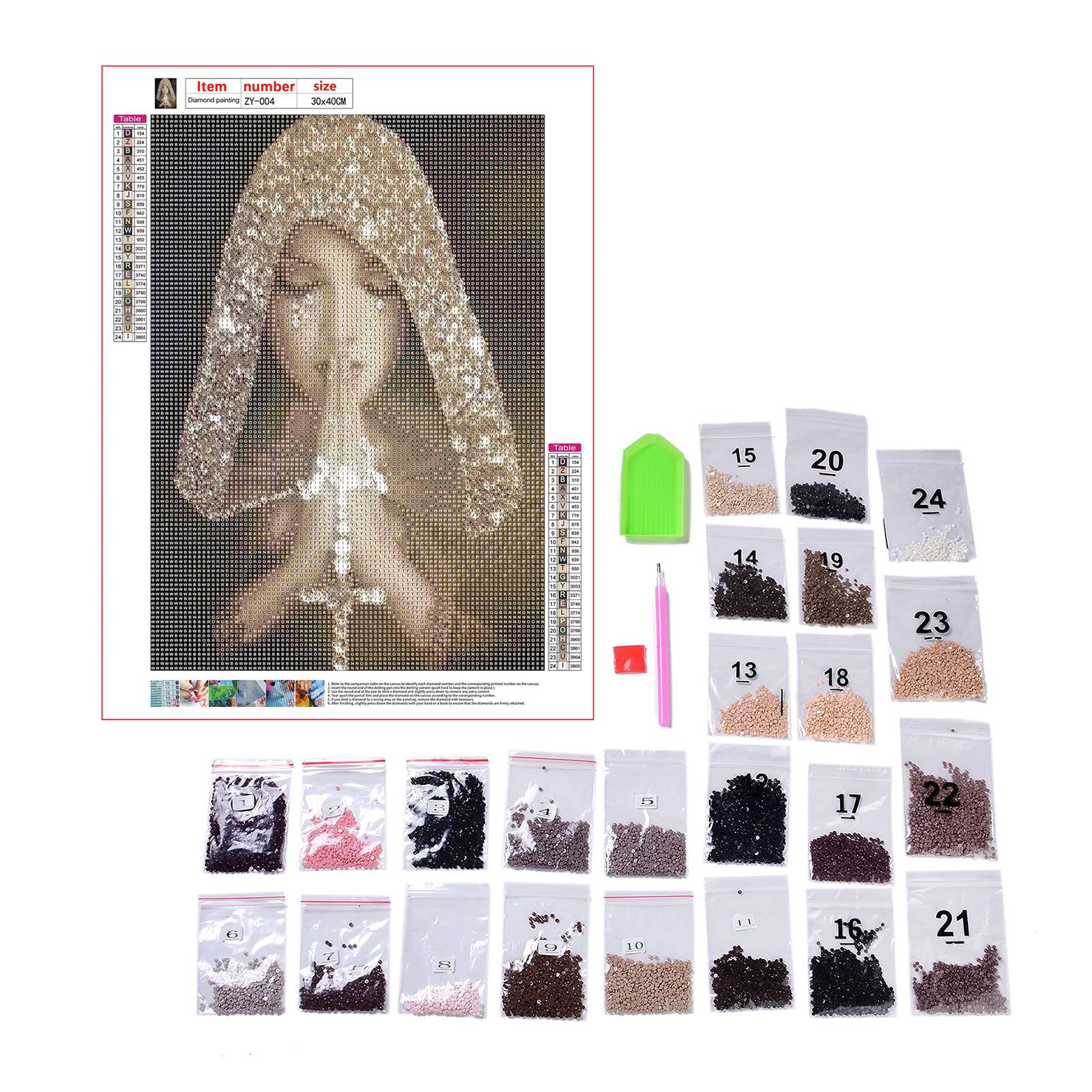 Each Kit Includes: Painting Canvas with clear painting symbol, tray, glue clay, enough drills, a diamond Sticky Pen. Only with this kit, you can finish an equisite diamond painting works.