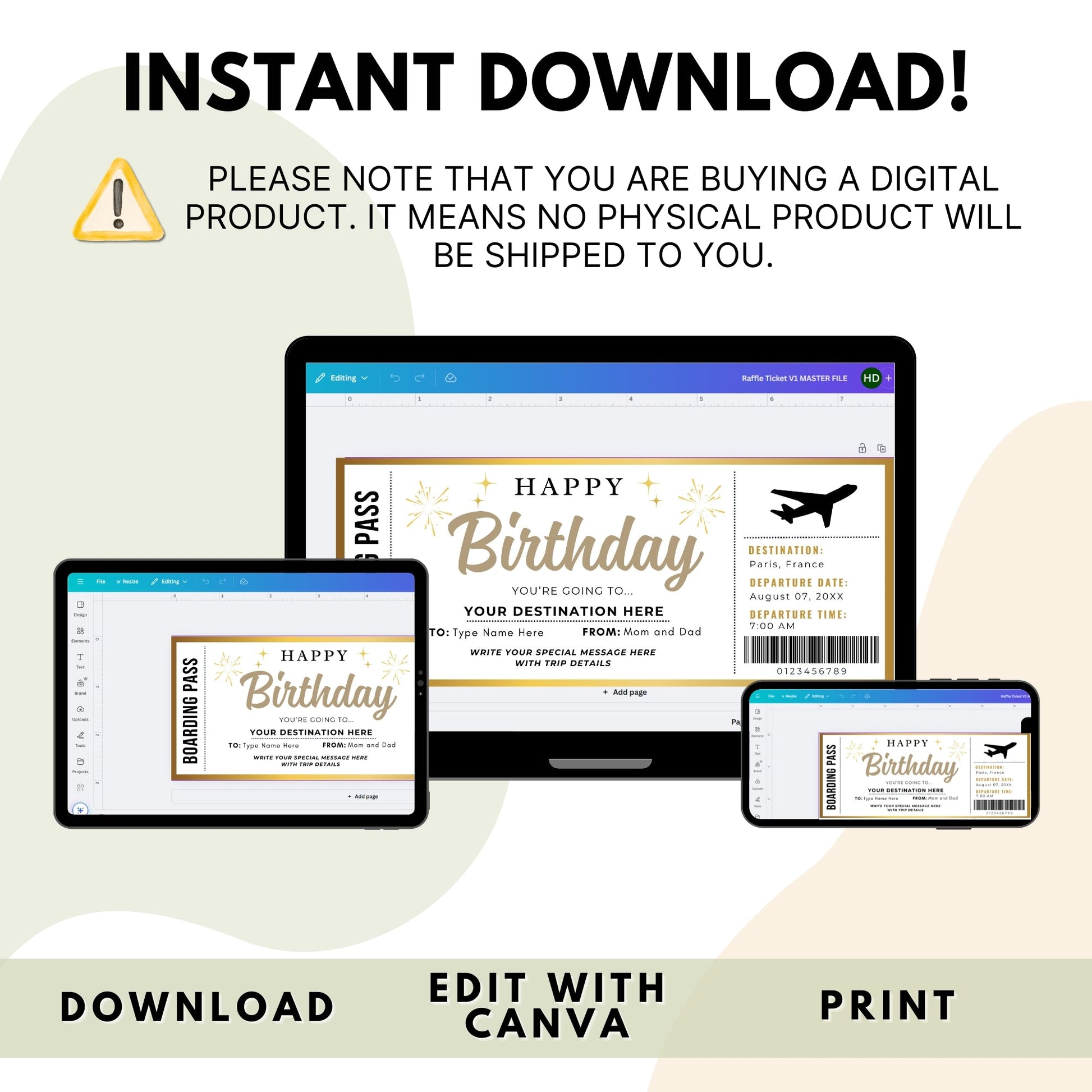 You can easily customize all the details¡ªname, destination, flight date, and personal message¡ªright from your computer using Canva. Whether you print it out or share it digitally, this travel-themed gift is a charming and personal way to present an unforgettable experience.