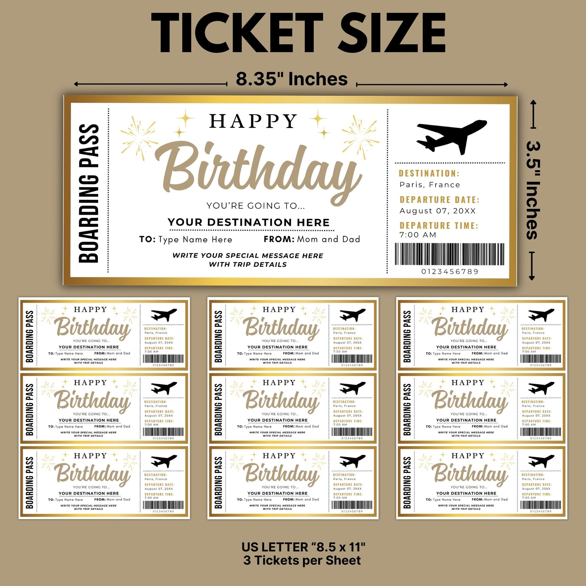 - Size: TICKET 8.35x3.5 Inches, US Letter 3 tickets per page.